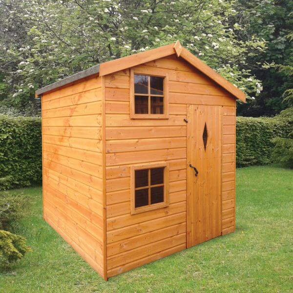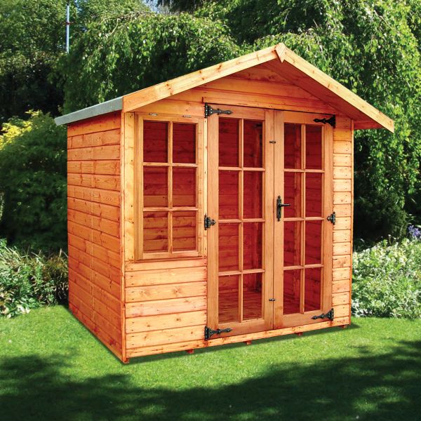 Compact Apex roof summerhouse, available to a 7 x 7, one opening window, offset double doors 300mm roof overhang
